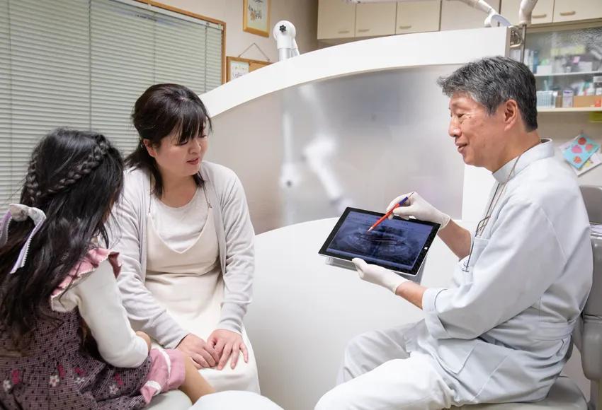 治療の進め方をていねいに説明します治療の進め方をしっかりと説明し、患者様にご納得いただいた上での治療を心がけています。治療方法が複数考えられる場合には、治療内容、治療期間、治療費などを含めたメリット・デメリットをきちんと、分かりやすい言葉でお伝えします。